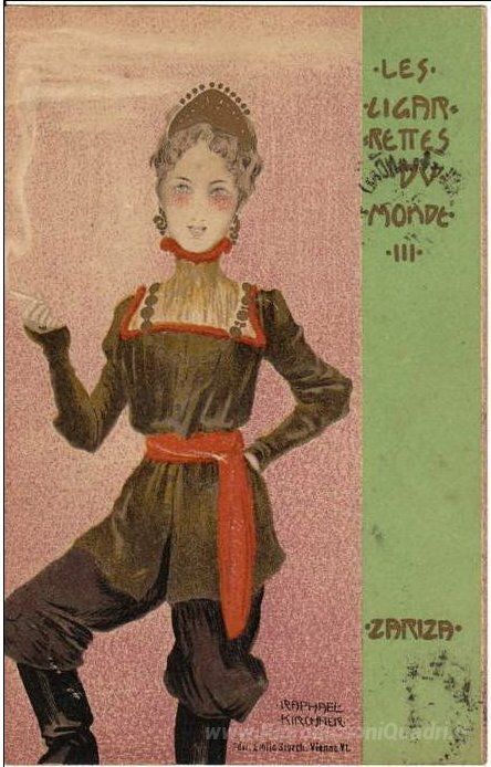 Ti offriamo una riproduzione artigianale su tela dell'opera famosa 'Le sigarette del mondo' di Raphael Kirchner, dal Museo delle Riproduzioni.