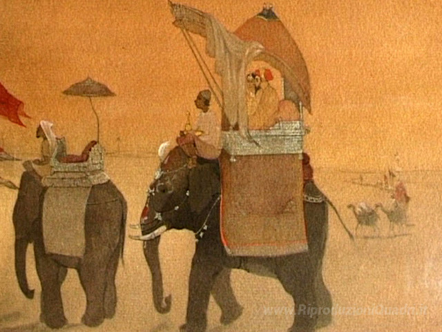 Ti offriamo una riproduzione artigianale su tela dell'opera famosa 'Marzo dell'imperatore a Kashmir' di Abanindranath Tagore, dal Museo delle Riproduzioni.