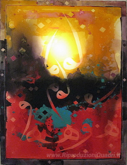 Ti offriamo una riproduzione artigianale su tela dell'opera famosa 'Calligrafia' di Abdul Qader Al Raes, dal Museo delle Riproduzioni.