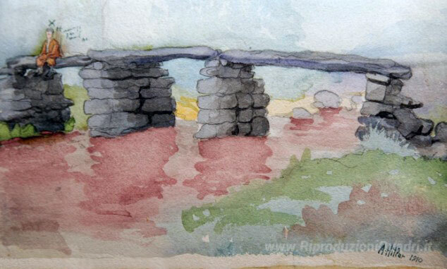 Ti offriamo una riproduzione artigianale su tela dell'opera famosa 'Autoritratto su un ponte di pietra (attribuita a Hitler)' di Adolf Hitler, dal Museo delle Riproduzioni.