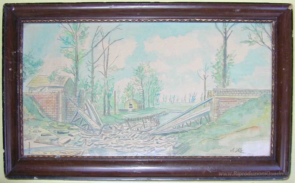 Ti offriamo una riproduzione artigianale su tela dell'opera famosa 'Distrutto Ponte' di Adolf Hitler, dal Museo delle Riproduzioni.