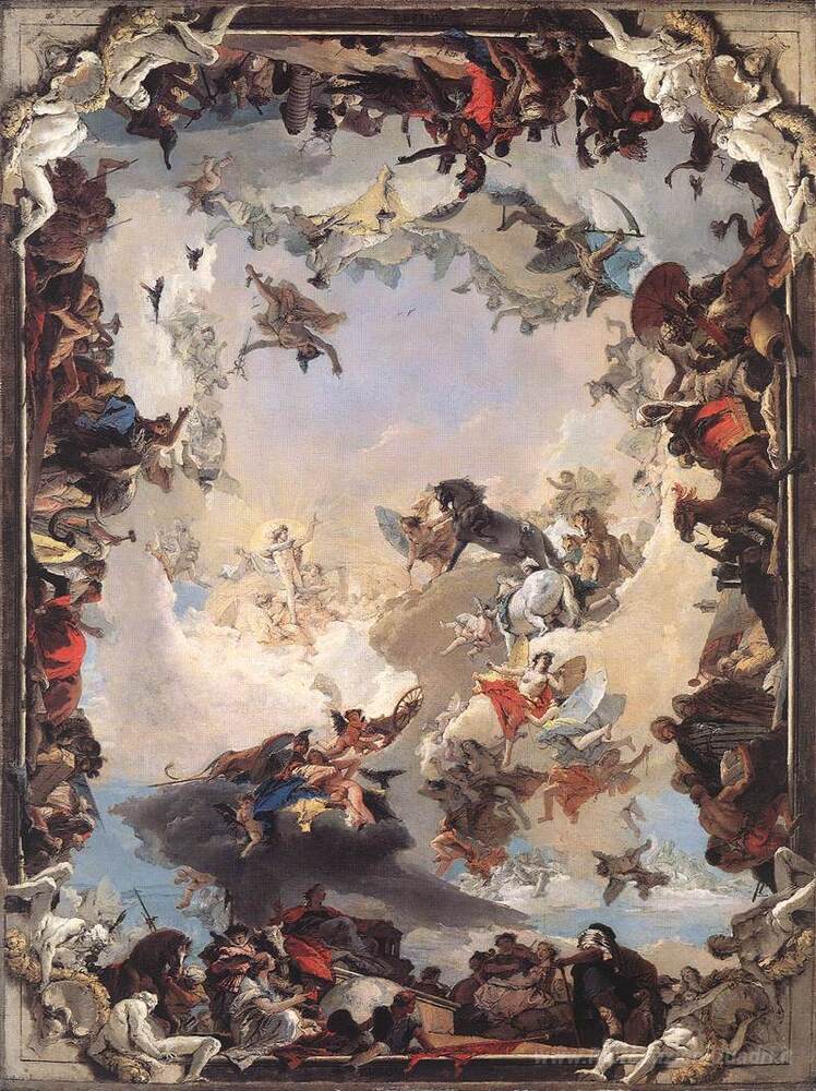 Ti offriamo una riproduzione artigianale su tela dell'opera famosa 'Allegoria dei Pianeti e Continenti' di Giovanni Battista Tiepolo, dal Museo delle Riproduzioni.