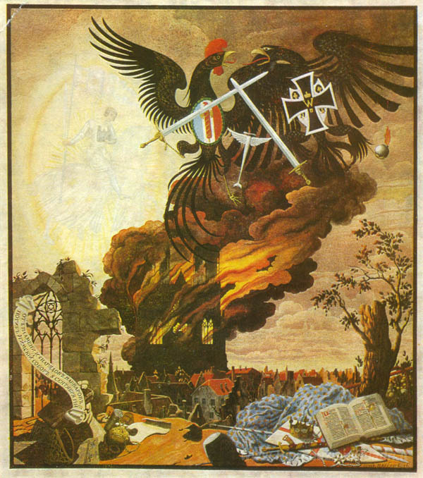 Ti offriamo una riproduzione artigianale su tela dell'opera famosa 'Allegoria della distruzione della cattedrale di Reims' di Heorhiy Narbut, dal Museo delle Riproduzioni.