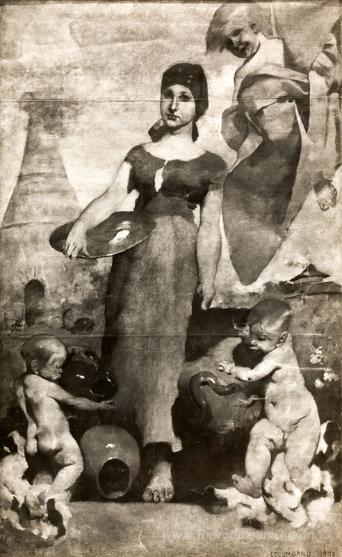Ti offriamo una riproduzione artigianale su tela dell'opera famosa 'Allegoria della Pittura Ceramica' di Columbano Bordalo Pinheiro, dal Museo delle Riproduzioni.