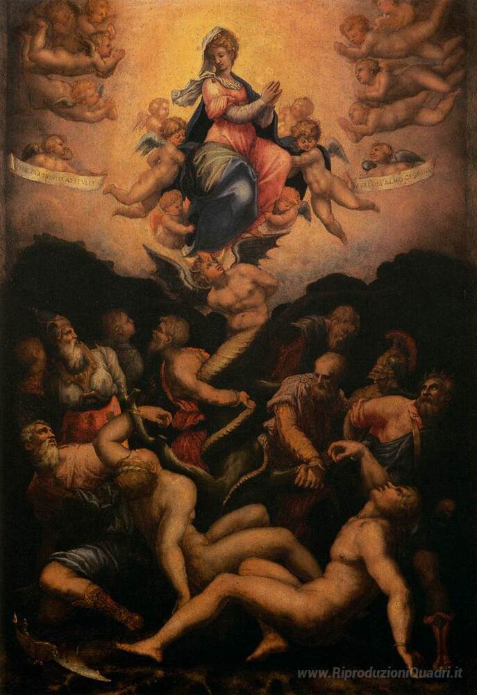 Ti offriamo una riproduzione artigianale su tela dell'opera famosa 'Allegoria dell'Immacolata Concezione' di Giorgio Vasari, dal Museo delle Riproduzioni.