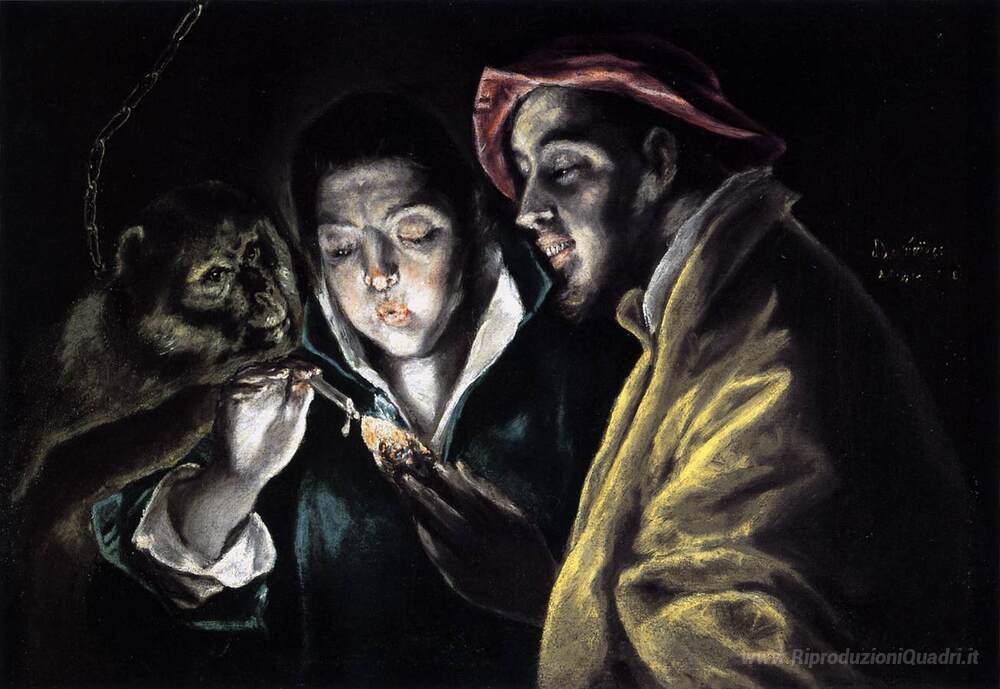 Ti offriamo una riproduzione artigianale su tela dell'opera famosa 'Allegoria, ragazzo illuminazione candela in compagnia di una sci' di El Greco, dal Museo delle Riproduzioni.