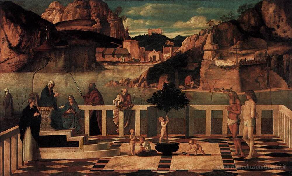 Ti offriamo una riproduzione artigianale su tela dell'opera famosa 'Allegoria sacra' di Giovanni Bellini, dal Museo delle Riproduzioni.