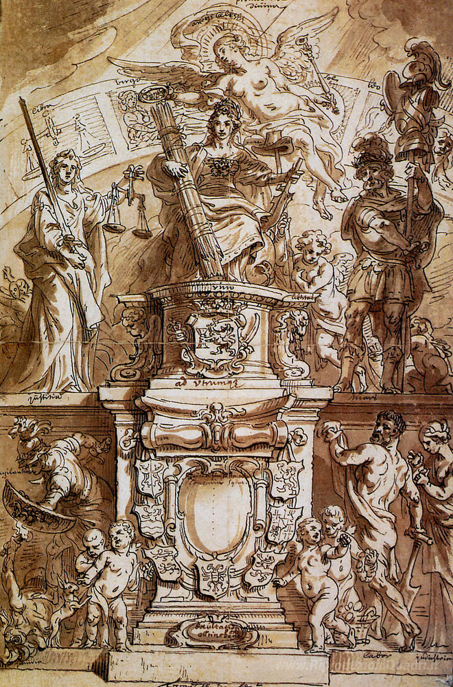 Ti offriamo una riproduzione artigianale su tela dell'opera famosa 'Allegoria Stati Provincia' di Theodoor van Thulden, dal Museo delle Riproduzioni.