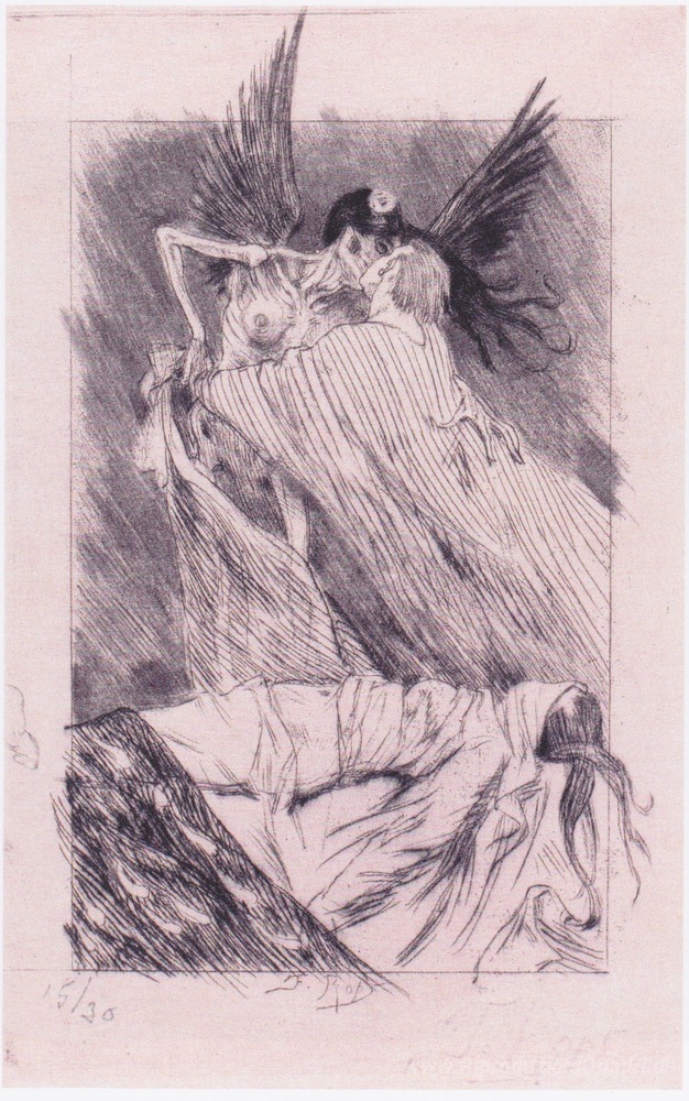 Ti offriamo una riproduzione artigianale su tela dell'opera famosa 'Baci di morte' di Felicien Rops, dal Museo delle Riproduzioni.