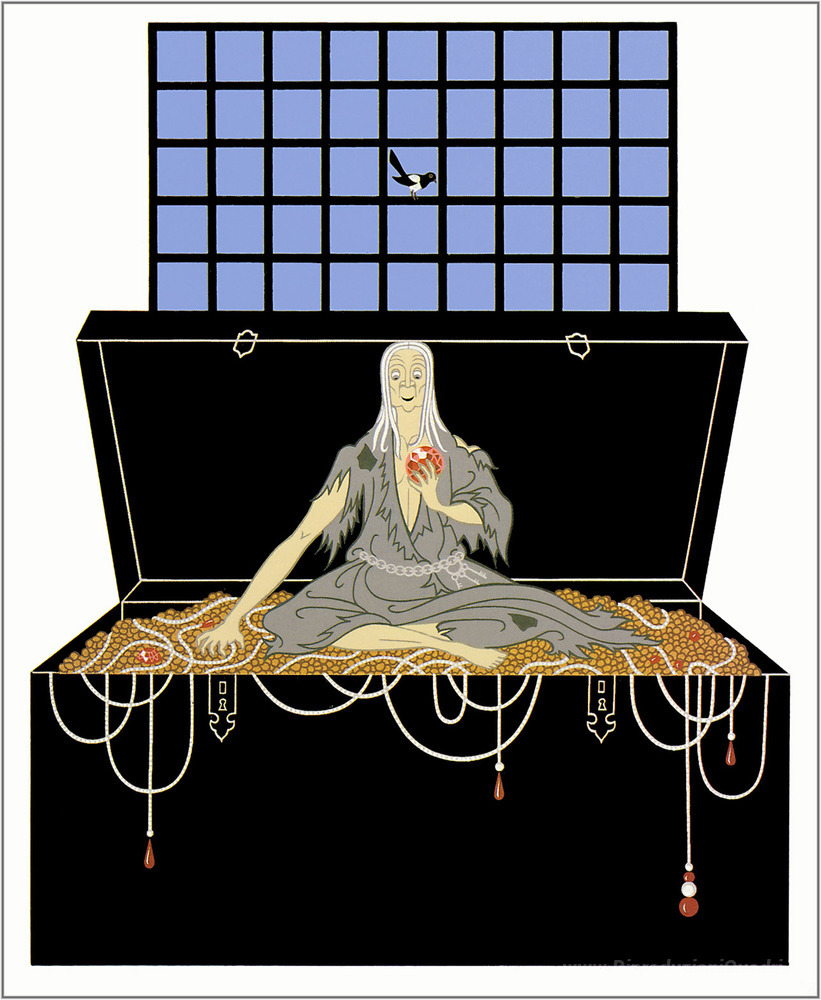 Ti offriamo una riproduzione artigianale su tela dell'opera famosa 'I sette peccati capitali, Avarizia' di Erte, dal Museo delle Riproduzioni.
