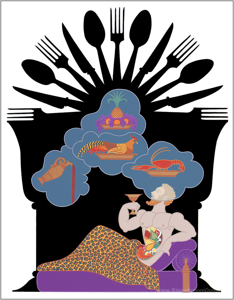 Ti offriamo una riproduzione artigianale su tela dell'opera famosa 'I sette peccati capitali, Gola' di Erte, dal Museo delle Riproduzioni.