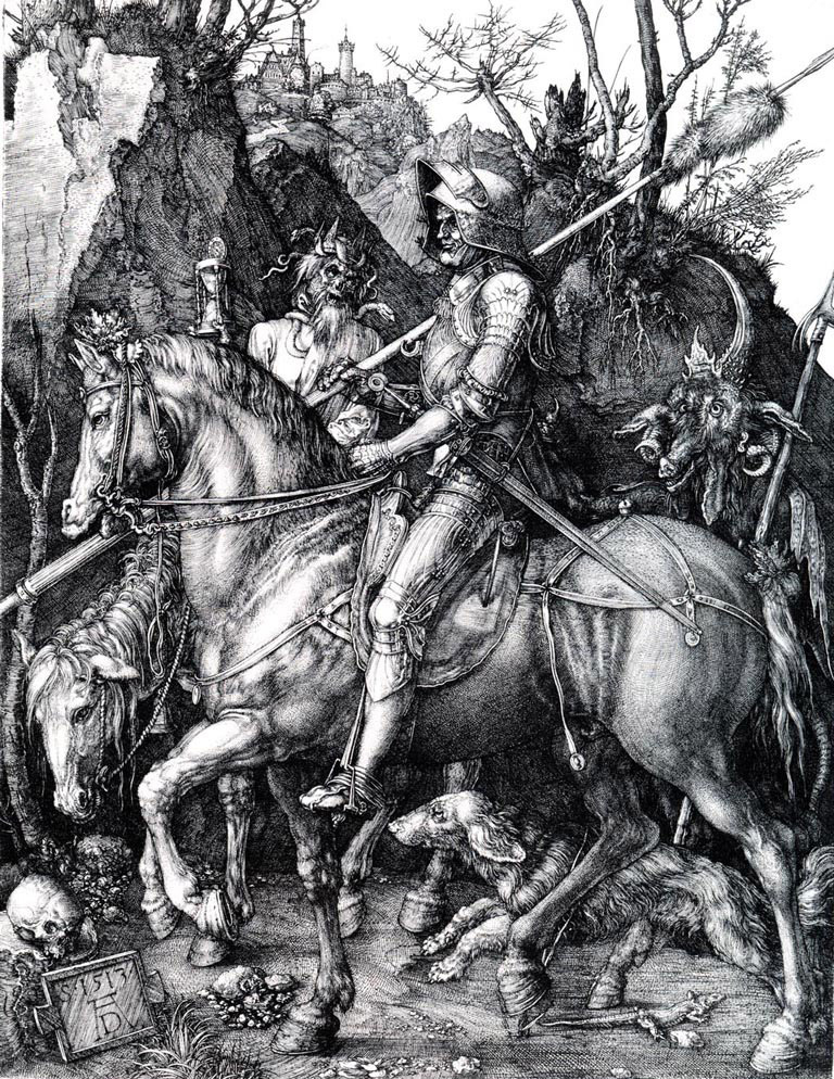 Ti offriamo una riproduzione artigianale su tela dell'opera famosa 'Il Cavaliere, la Morte e il Diavolo' di Albrecht Durer, dal Museo delle Riproduzioni.