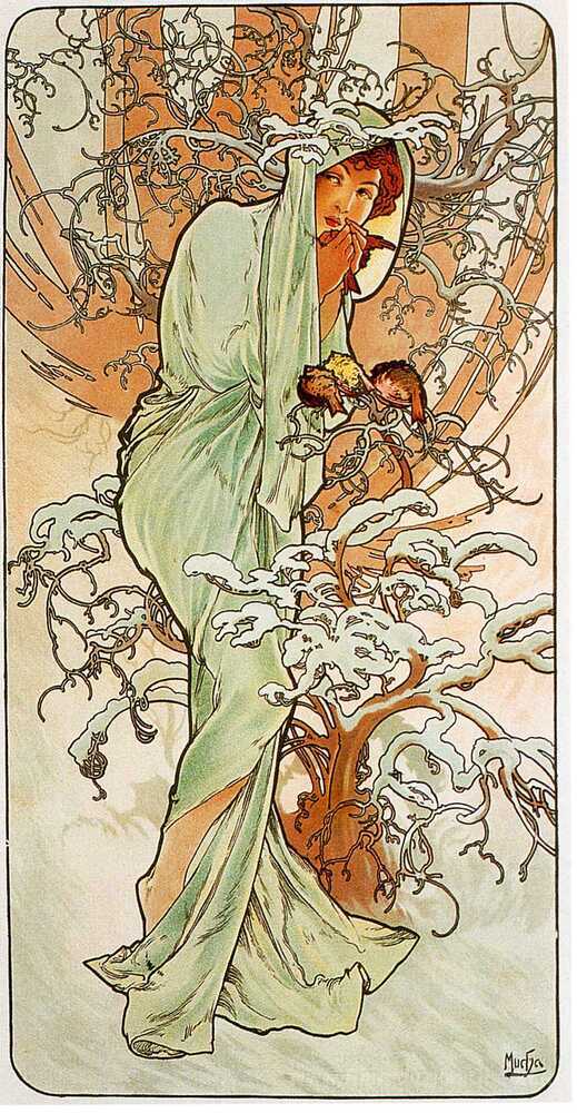 Ti offriamo una riproduzione artigianale su tela dell'opera famosa 'Inverno' di Alphonse Mucha, dal Museo delle Riproduzioni.