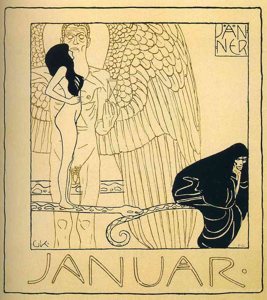 Ti offriamo una riproduzione artigianale su tela dell'opera famosa 'Januar' di Gustav Klimt, dal Museo delle Riproduzioni.