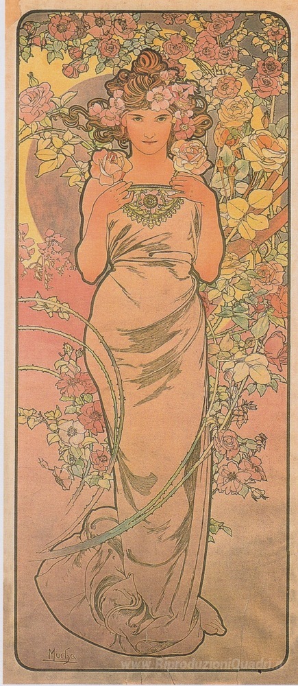 Ti offriamo una riproduzione artigianale su tela dell'opera famosa 'La rosa' di Alphonse Mucha, dal Museo delle Riproduzioni.