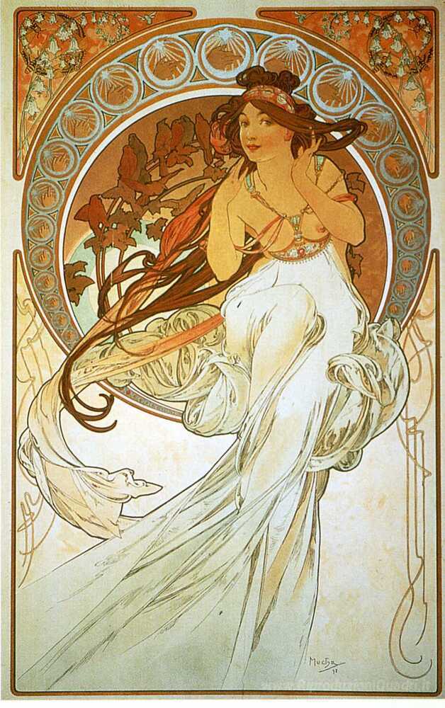 Ti offriamo una riproduzione artigianale su tela dell'opera famosa 'Musica' di Alphonse Mucha, dal Museo delle Riproduzioni.