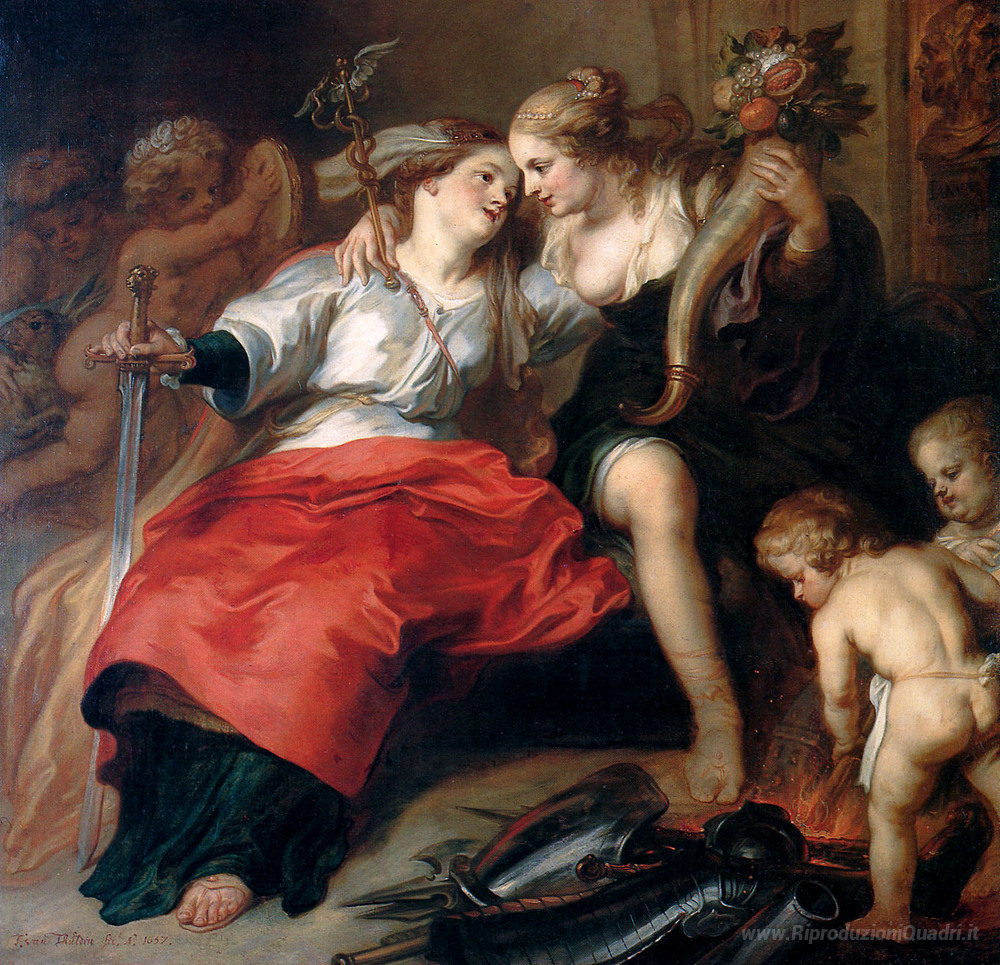 Ti offriamo una riproduzione artigianale su tela dell'opera famosa 'Ritorno della Pace' di Theodoor van Thulden, dal Museo delle Riproduzioni.