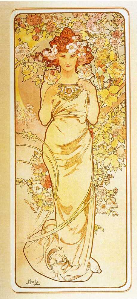 Ti offriamo una riproduzione artigianale su tela dell'opera famosa 'Rosa' di Alphonse Mucha, dal Museo delle Riproduzioni.