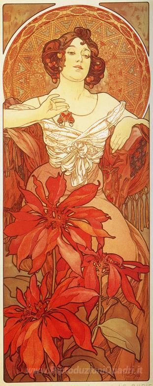 Ti offriamo una riproduzione artigianale su tela dell'opera famosa 'Rubino' di Alphonse Mucha, dal Museo delle Riproduzioni.