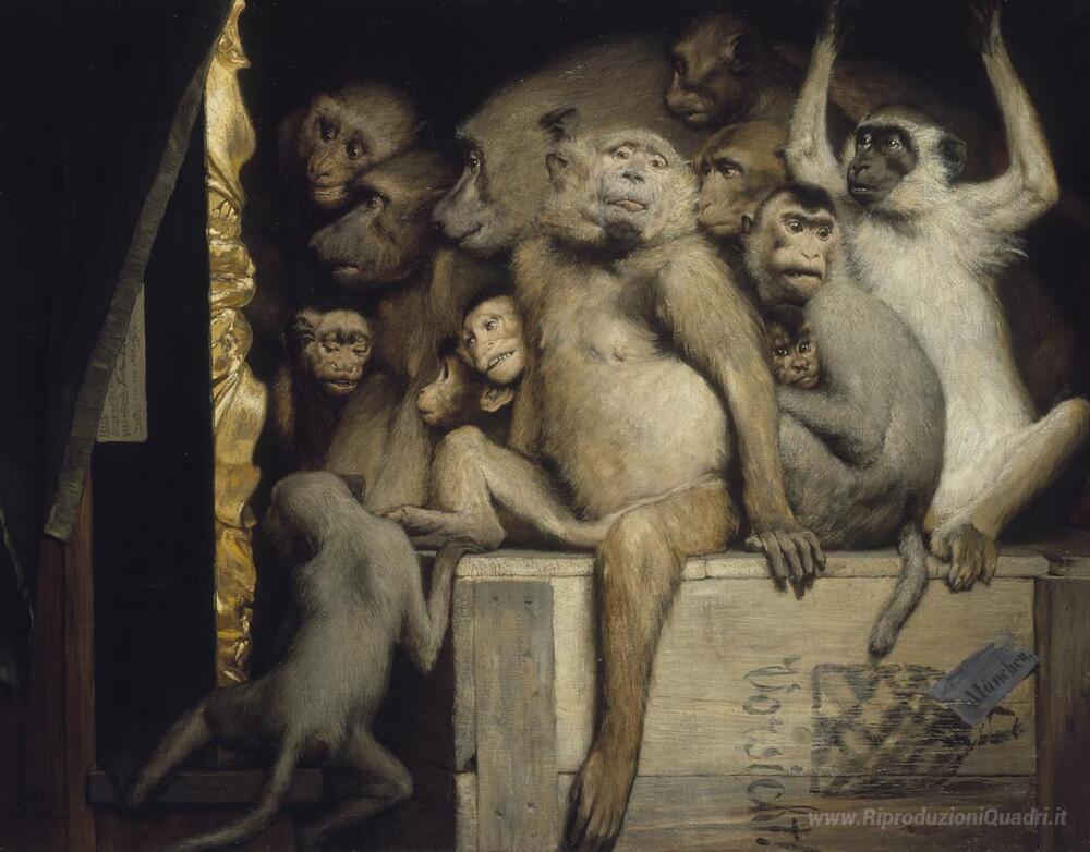 Ti offriamo una riproduzione artigianale su tela dell'opera famosa 'Scimmie come giudici d'Arte' di Gabriel von Max, dal Museo delle Riproduzioni.