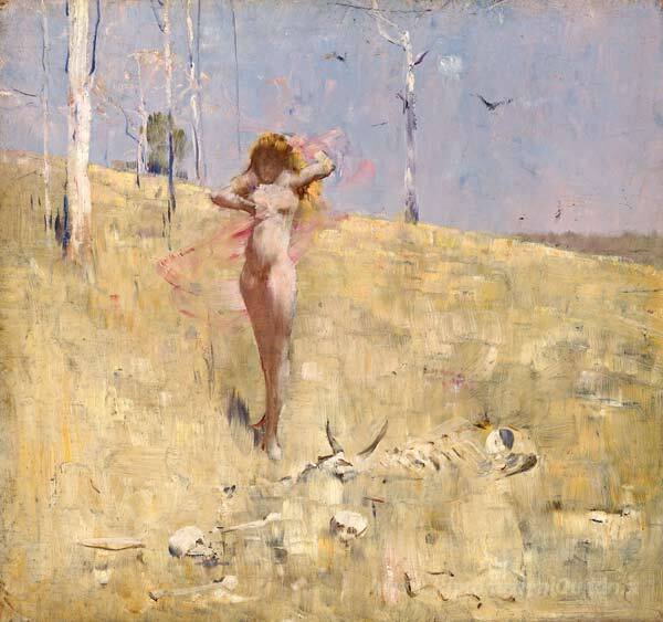 Ti offriamo una riproduzione artigianale su tela dell'opera famosa 'Spirito della siccità' di Arthur Streeton, dal Museo delle Riproduzioni.