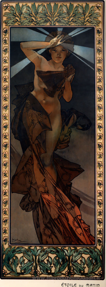 Ti offriamo una riproduzione artigianale su tela dell'opera famosa 'stella del mattino' di Alphonse Mucha, dal Museo delle Riproduzioni.
