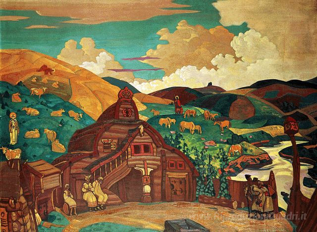 Ti offriamo una riproduzione artigianale su tela dell'opera famosa 'Tre piaceri' di Nicholas Roerich, dal Museo delle Riproduzioni.