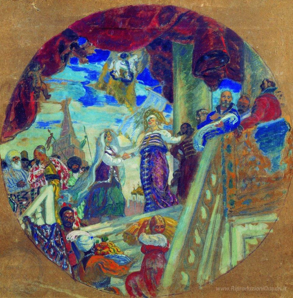 Ti offriamo una riproduzione artigianale su tela dell'opera famosa 'Unire Kazan in Russia. Allegoria' di Boris Kustodiev, dal Museo delle Riproduzioni.