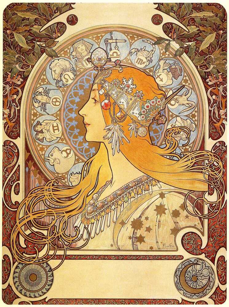 Ti offriamo una riproduzione artigianale su tela dell'opera famosa 'Zodiac' di Alphonse Mucha, dal Museo delle Riproduzioni.