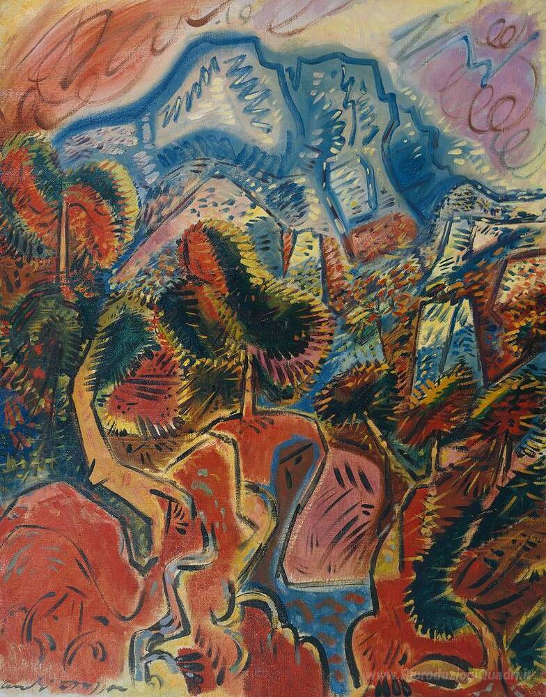 Ti offriamo una riproduzione artigianale su tela dell'opera famosa 'Le terre rosse e la Montagne Sainte Victoire' di Andre Masson, dal Museo delle Riproduzioni.