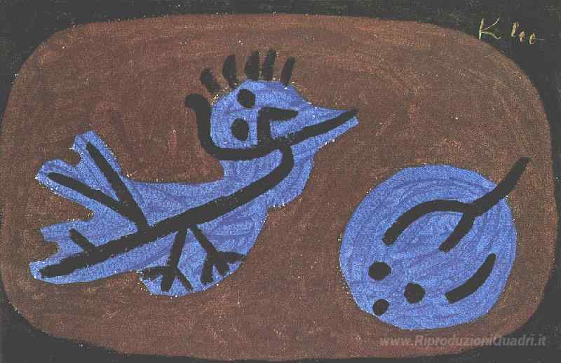 Ti offriamo una riproduzione artigianale su tela dell'opera famosa 'Blu zucca uccello' di Paul Klee, dal Museo delle Riproduzioni.