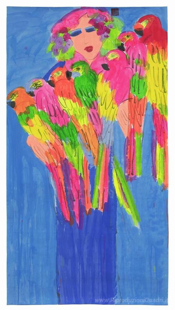 Ti offriamo una riproduzione artigianale su tela dell'opera famosa 'Blue Lady con pappagalli' di Walasse Ting, dal Museo delle Riproduzioni.