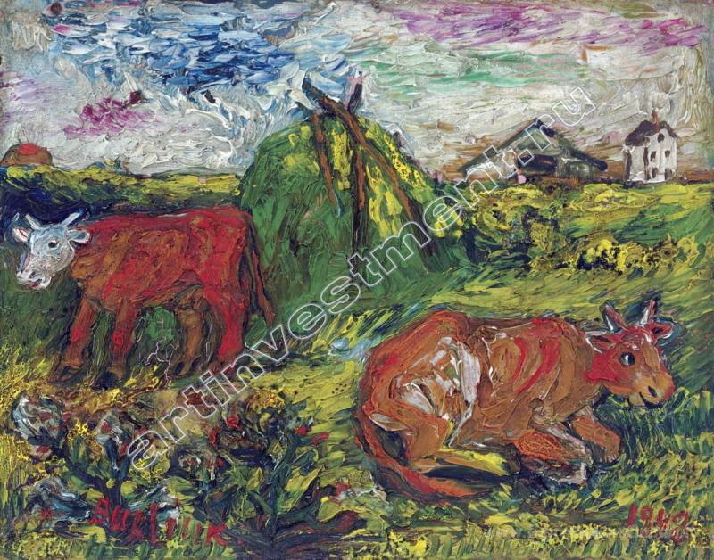 Ti offriamo una riproduzione artigianale su tela dell'opera famosa 'Campo con bestiame' di David Burliuk, dal Museo delle Riproduzioni.