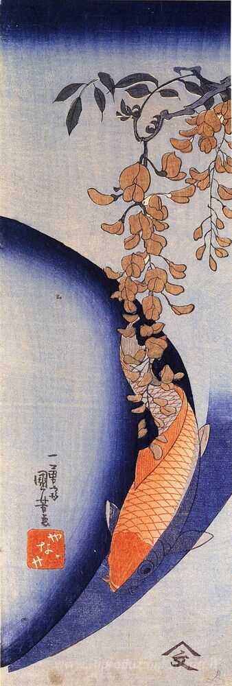 Ti offriamo una riproduzione artigianale su tela dell'opera famosa 'Carp rossa sotto glicine' di Utagawa Kuniyoshi, dal Museo delle Riproduzioni.