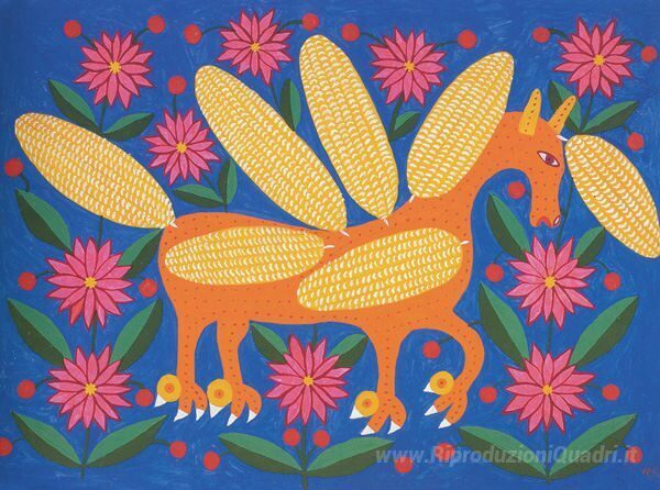 Ti offriamo una riproduzione artigianale su tela dell'opera famosa 'Cavallo Corncob nello spazio' di Maria Primachenko, dal Museo delle Riproduzioni.