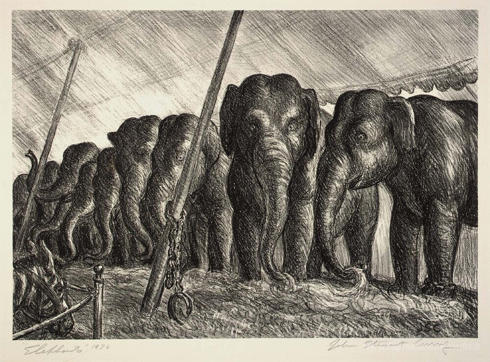 Ti offriamo una riproduzione artigianale su tela dell'opera famosa 'Circo Elefanti' di John Steuart Curry, dal Museo delle Riproduzioni.