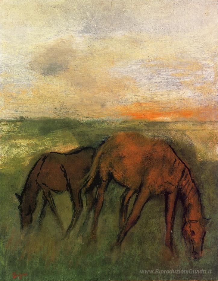 Ti offriamo una riproduzione artigianale su tela dell'opera famosa 'Due cavalli in un pascolo' di Edgar Degas, dal Museo delle Riproduzioni.