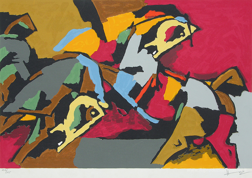 Ti offriamo una riproduzione artigianale su tela dell'opera famosa 'Due Cavalli' di M.F. Husain, dal Museo delle Riproduzioni.