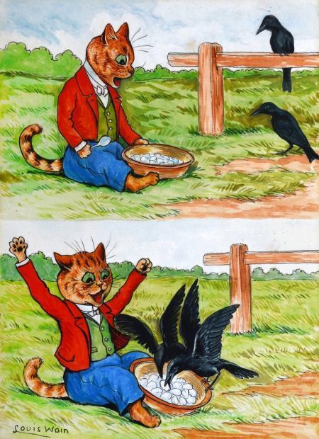 Ti offriamo una riproduzione artigianale su tela dell'opera famosa 'Due corvi IMPERTINENTI' di Louis Wain, dal Museo delle Riproduzioni.