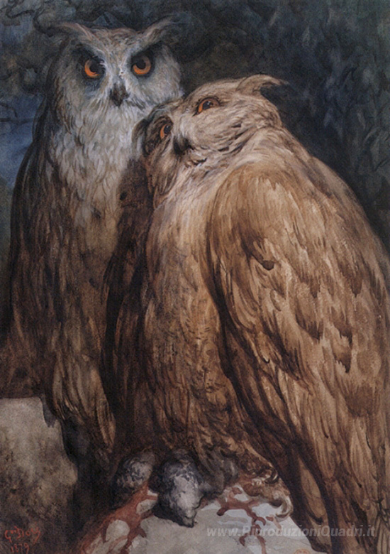 Ti offriamo una riproduzione artigianale su tela dell'opera famosa 'Due Gufi' di Gustave Dore, dal Museo delle Riproduzioni.