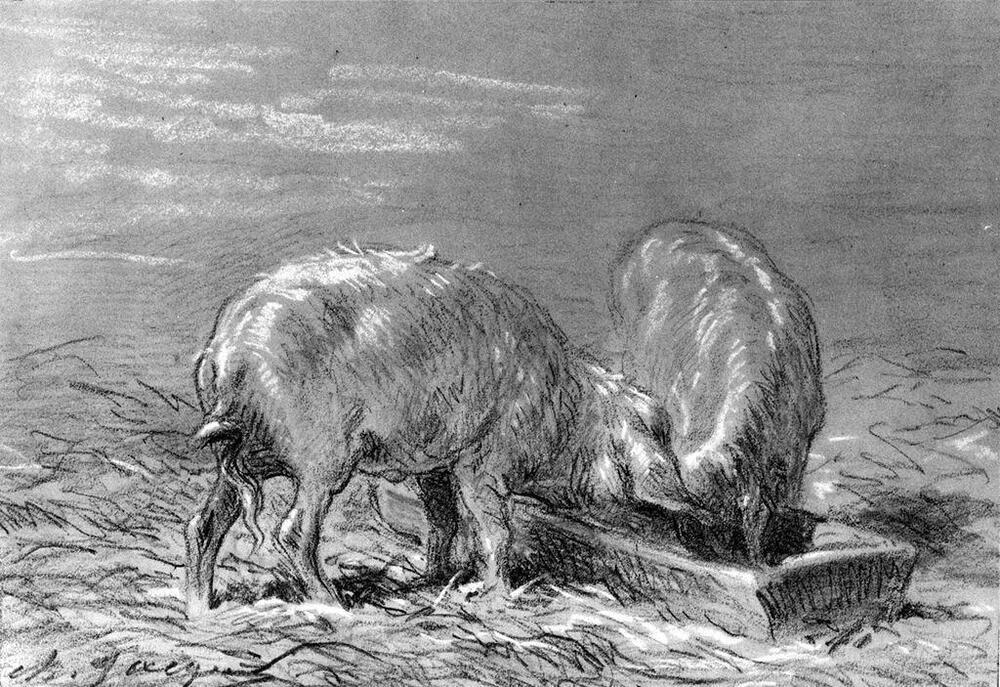 Ti offriamo una riproduzione artigianale su tela dell'opera famosa 'Due maiali Mangiare da una depressione' di Charles Jacque, dal Museo delle Riproduzioni.