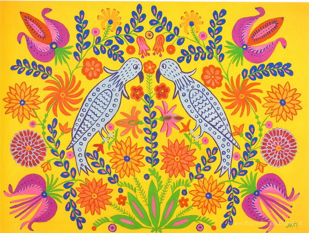 Ti offriamo una riproduzione artigianale su tela dell'opera famosa 'Due pappagalli fatto una passeggiata insieme in primavera' di Maria Primachenko, dal Museo delle Riproduzioni.