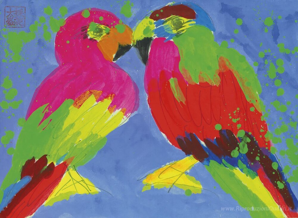 Ti offriamo una riproduzione artigianale su tela dell'opera famosa 'Due pappagalli' di Walasse Ting, dal Museo delle Riproduzioni.