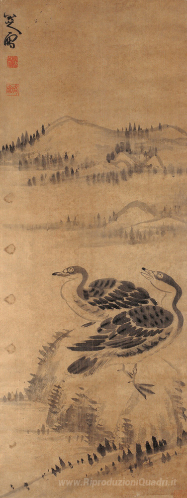 Ti offriamo una riproduzione artigianale su tela dell'opera famosa 'Due Wild Geese' di Bada Shanren, dal Museo delle Riproduzioni.