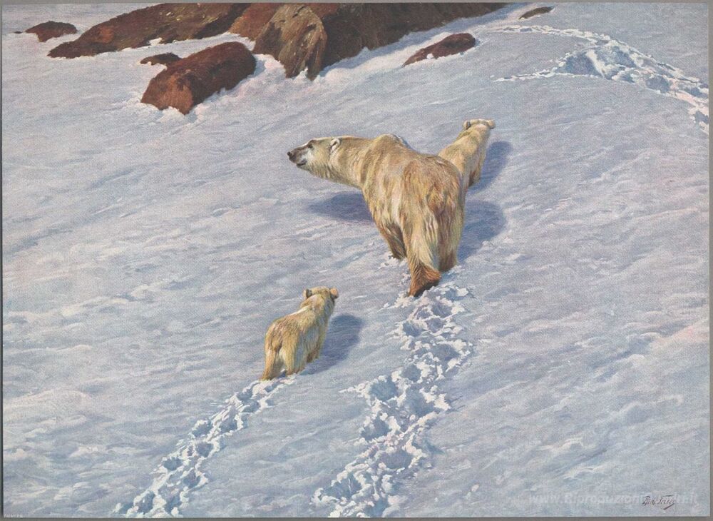 Ti offriamo una riproduzione artigianale su tela dell'opera famosa 'Famiglia dell'orso polare' di Richard Friese, dal Museo delle Riproduzioni.