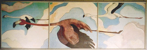 Ti offriamo una riproduzione artigianale su tela dell'opera famosa 'Fenicotteri in volo' di Arman Manookian, dal Museo delle Riproduzioni.