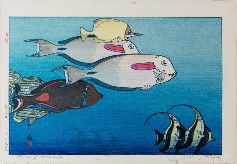 Ti offriamo una riproduzione artigianale su tela dell'opera famosa 'Fishes di Honolulu' di Hiroshi Yoshida, dal Museo delle Riproduzioni.