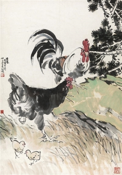 Ti offriamo una riproduzione artigianale su tela dell'opera famosa 'Galli e pulcini' di Xu Beihong, dal Museo delle Riproduzioni.