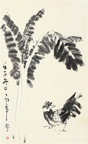 Ti offriamo una riproduzione artigianale su tela dell'opera famosa 'Gallo e foglie di banana' di Ding Yanyong, dal Museo delle Riproduzioni.