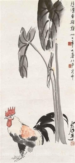 Ti offriamo una riproduzione artigianale su tela dell'opera famosa 'Gallo e Taro Foglie' di Xu Beihong, dal Museo delle Riproduzioni.